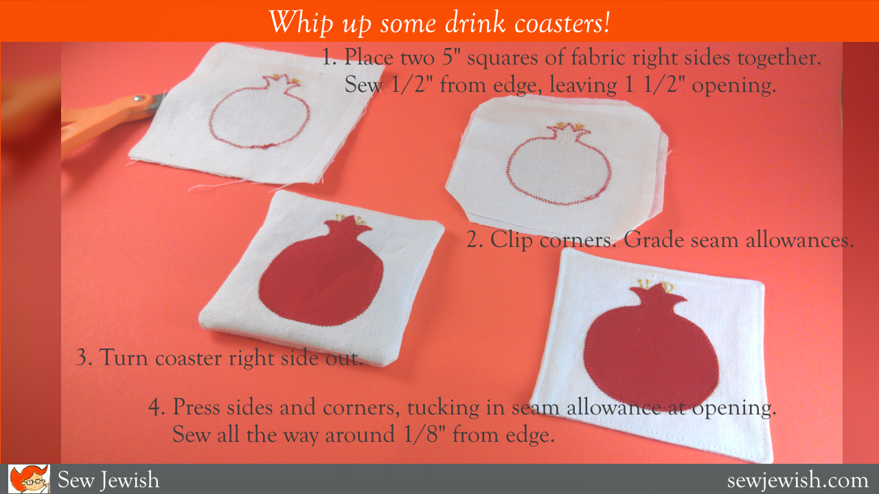 Squares of fabric whip up into drink coasters pretty quickly. Make a set for yourself or a hostess gift. We kicked ours up a notch for a Passover craft swap with pomegranate appliques based on the pomegranate atarah pattern — I’m kind of in a pomegranate place right now — but the general instructions apply whether the fabric is embellished or not. Use any non-stretch woven fabric, like linen, unbleached organic cotton, or quilting scraps. The top and bottom layers of fabric don’t have to be the same. You can switch up the colors, textures, or prints. Just be sure to wash and dry the fabrics before you cut; you’ll want the finished coasters to be able to stand up to an occasional wash.