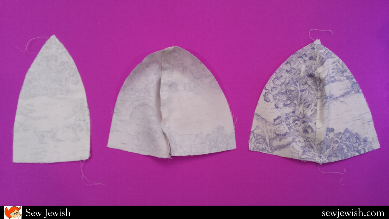 With right sides together, sew a third Crown piece to the first two pieces. Finish the seam as before.