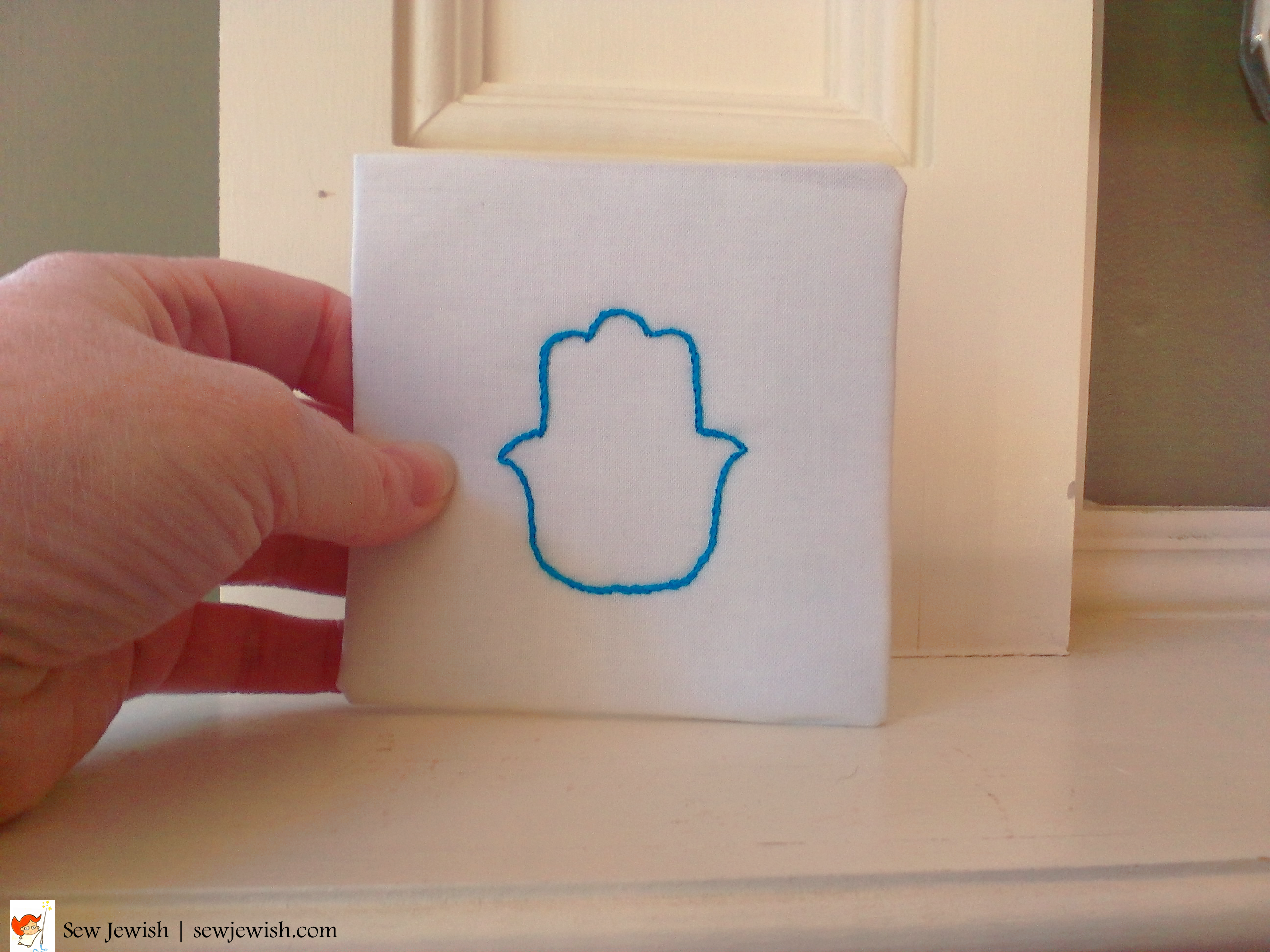 While attending the Association of Jewish Libraries conference earlier this year to spread the word about Sew Jewish, I gave quick little stem stitch lessons using this hamsa. I wish I had time to write up a blog post just about the conference. A number of attendees shared stories about learning to sew from their mothers and grandmothers, and I even met a few fellow members of the Pomegranate Guild of Judaic Needlework.