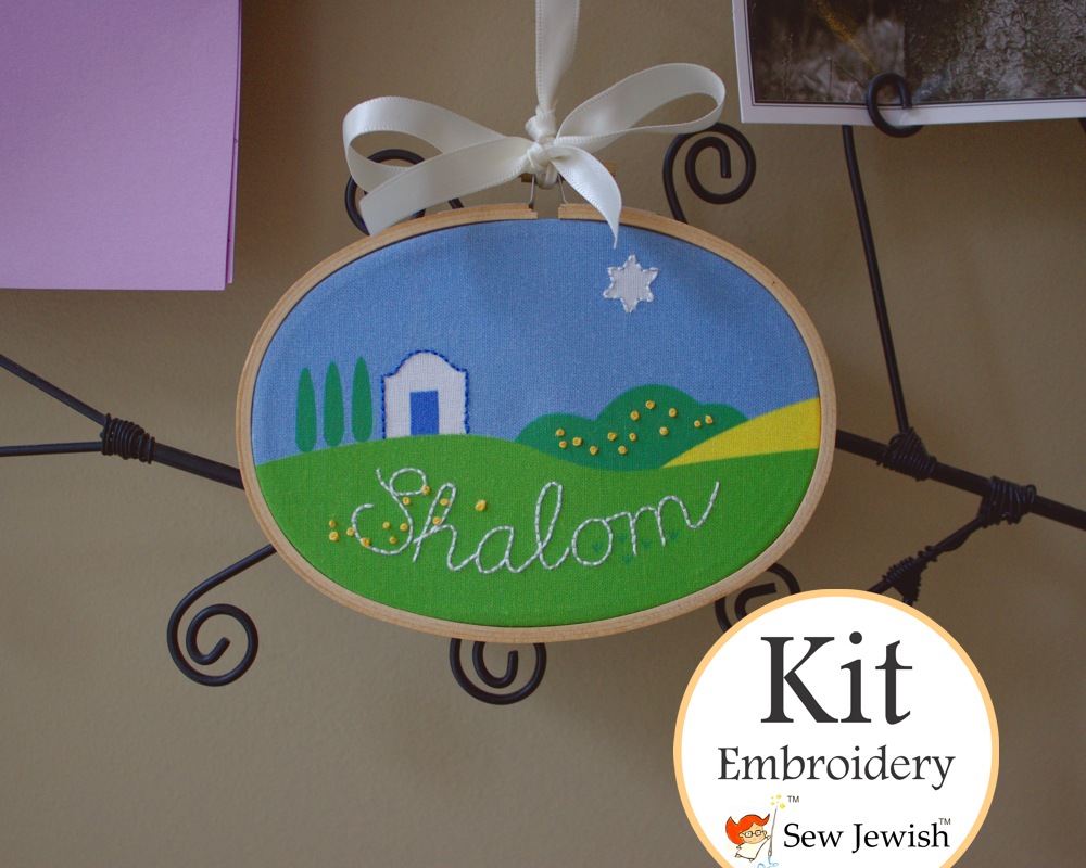 This little shalom home scene makes the perfect beginner embroidery kit. The project starts with a complete scene pre-printed on the fabric, so you can add as much embroidery as you like. Developed originally for beginner embroidery classes, so that no matter how much of the design is embroidered during one class session the student takes home a piece that is ready to be hung in their home.